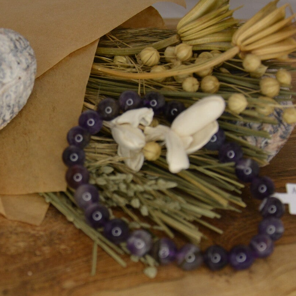 - En lithothérapie, l’améthyste est une pierre relaxante, elle apporte calme et sérénité, elle apporte la paix intérieur ainsi que celle de la maison.